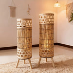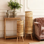 This set includes tall, cylindrical lamps in different heights. Each lamp stands on three short legs that raise the body slightly from the surface. The lamp is made from narrow vertical slats. The top and bottom sections feature a cutout lattice pattern that wraps fully around the cylinder.